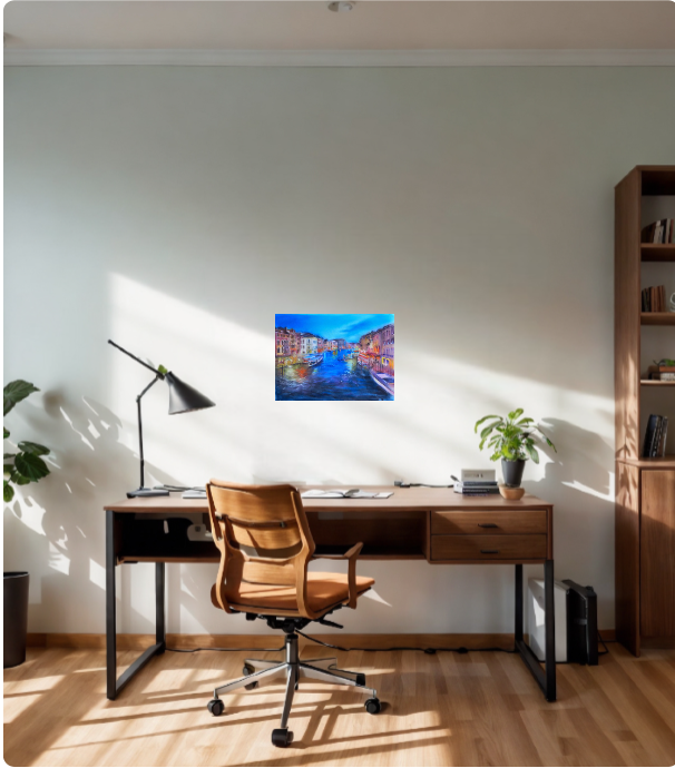 Original ink painting on canvas. View of the Grand Canal in Venice from the Rialto Bridge at dusk on a clear day. The artist's aim was to highlight the flashes and the first lights of the evening by playing on the contrasts between warm and cold hues,