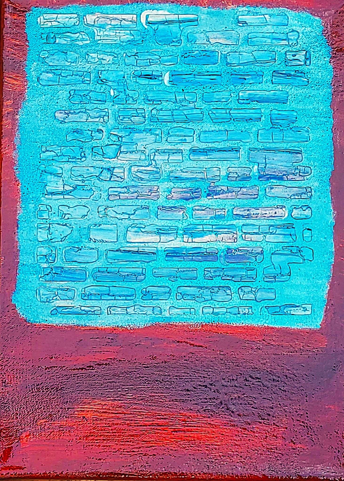 She plays with shapes, intensity of colors, superposition of materials, contrasts to create unreal atmospheres. Her compositions are nourished by materials as varied as acrylic, oil, coatings, sand, marble powder, collages, etc.
