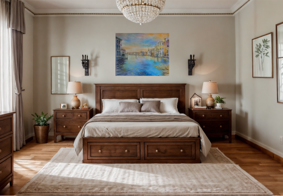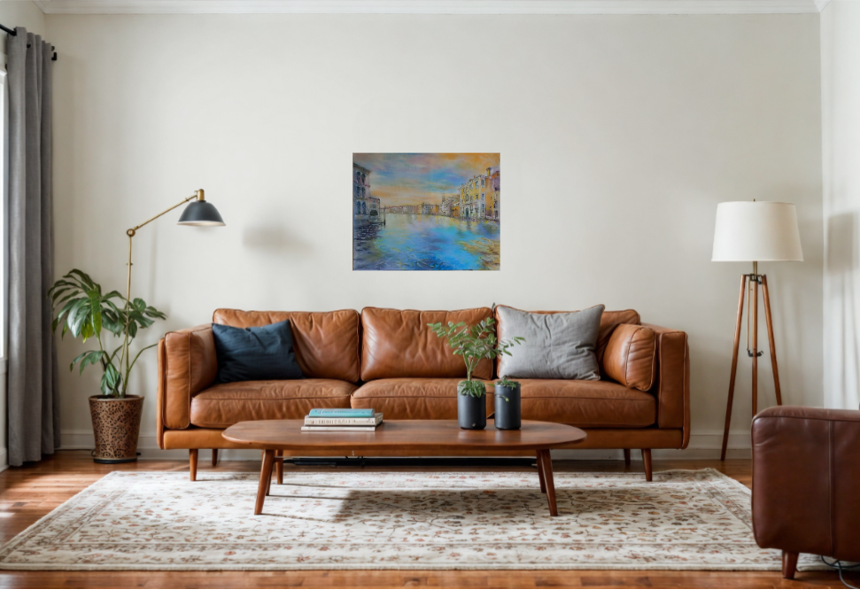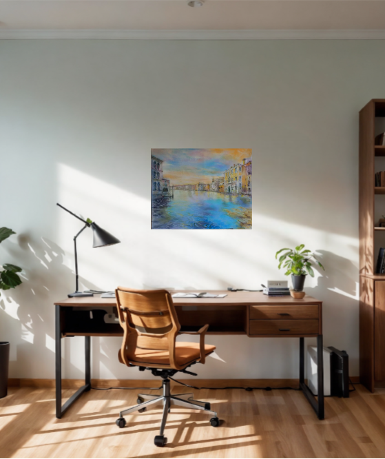 Original painting made with inks on canvas. Afternoon view of the Grand Canal after the storm. The image is an attempt to capture the harmony and the different chromatic nuances and the multitude of reflections on the water.