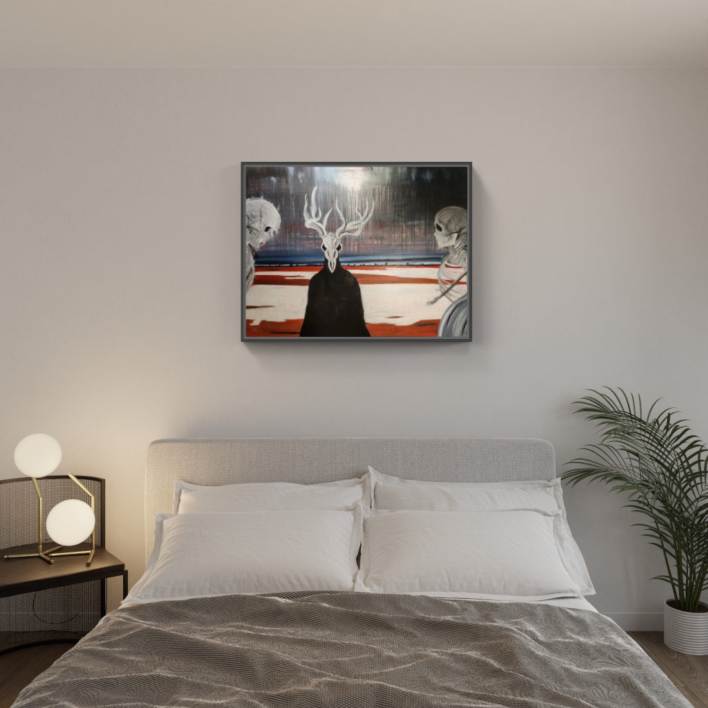 Winter landscape surrounded by a pagan master in front of 2 skeletons