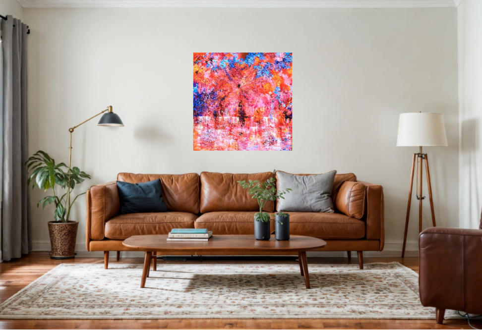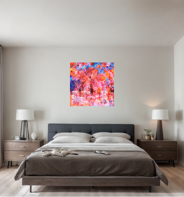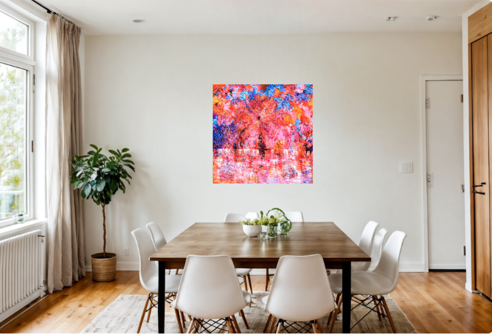 This painting evokes a world where nature, in its most vibrant brilliance, opposes the madness that surrounds us. The peaceful reflections on the water are a reminder of the serenity that we seek to preserve in a hectic daily life.
