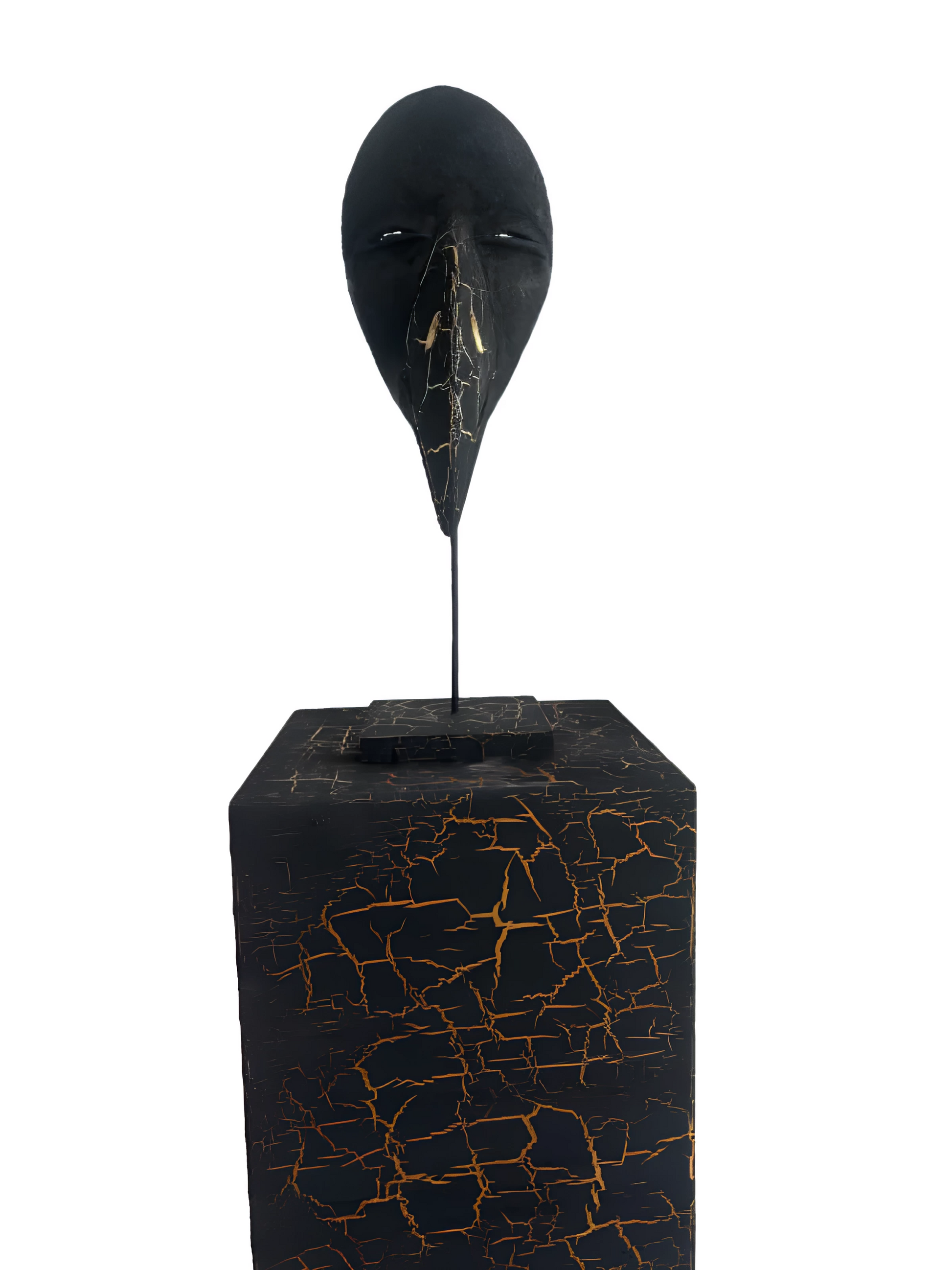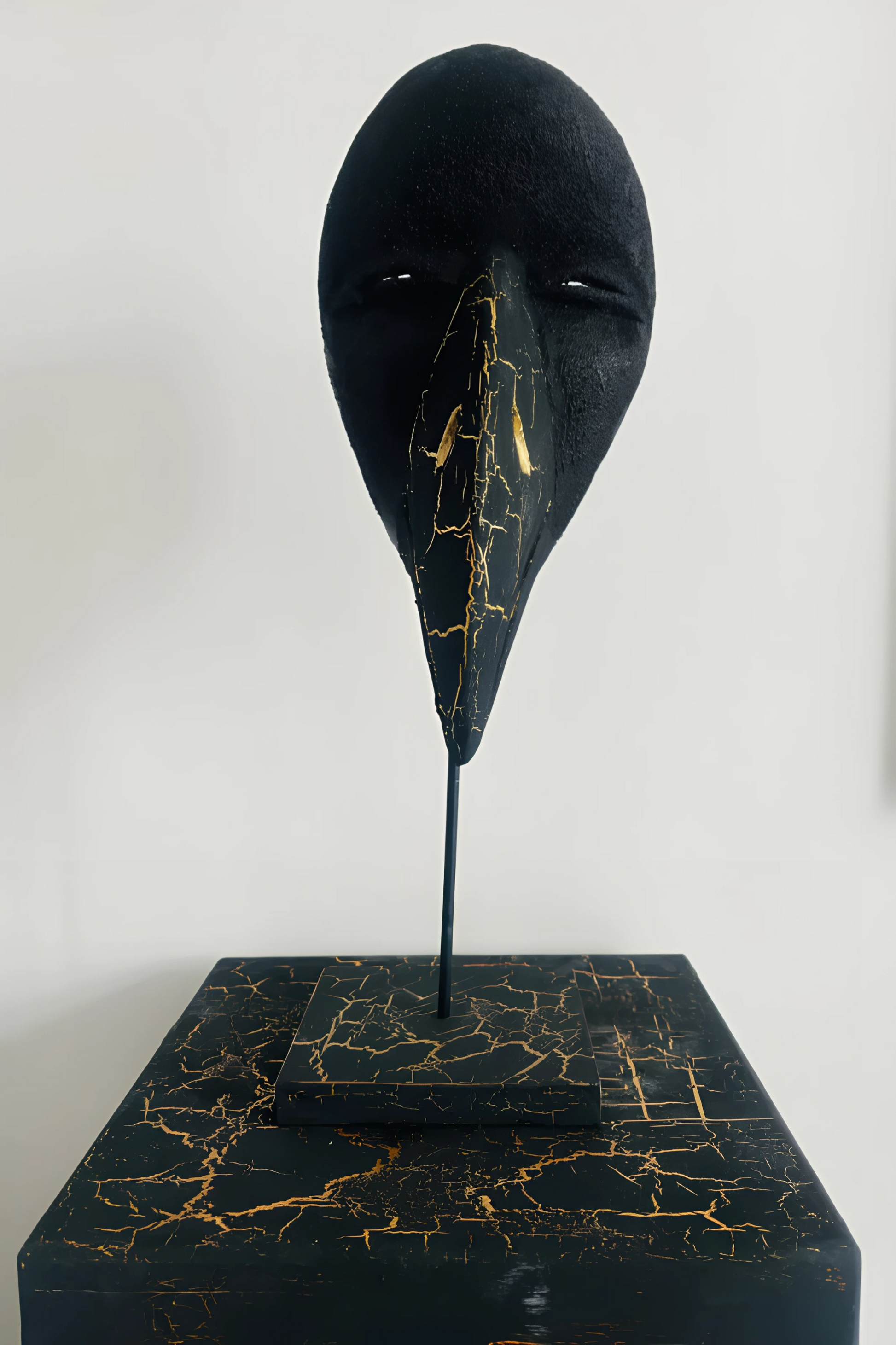 The mask is enhanced with crackled effects and gold leaf, adding a touch of elegance and mystery. The cracks evoke the passage of time, while the gold leaf symbolizes wealth and strength. The contrasting colors transform the mask into a contemporary and luxurious work.