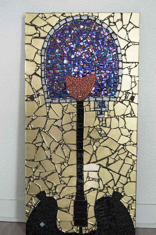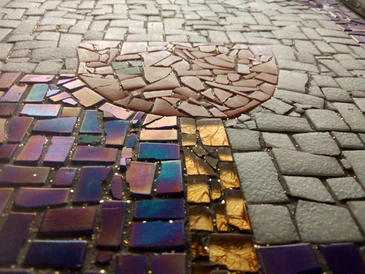 Materials: Plywood board, silver tiles, red iridescent glass paste, blue and off-yellow mosaic