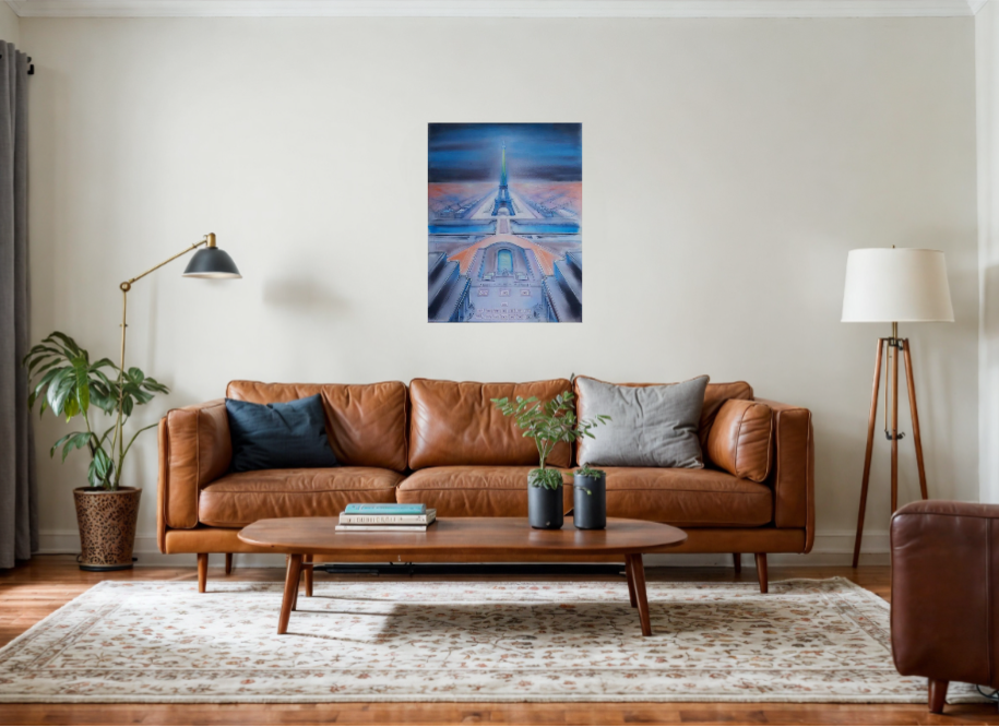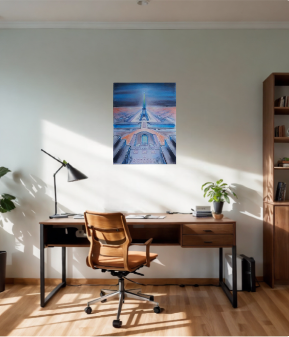 Original painting done in inks on cotton canvas. The subject represents the view of the Eiffel Tower from the top of the Palais de Chaillot at the Trocadéro. The artist opted for a bird's eye view of the panorama with a high horizon line and at the same time a single vanishing point perspective to create the illusion of depth. In all this, there is an attempt to create a dreamlike atmosphere, without characters, where the changing and shaded backgrounds of colors as well as the lights give the painting a vaguely surreal, almost lunar appearance. This ink painting becomes extremely permanent and stable once dried. Signed and dated on the front. Excellent condition.