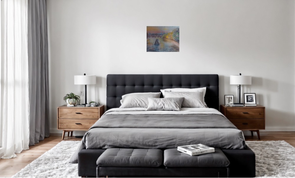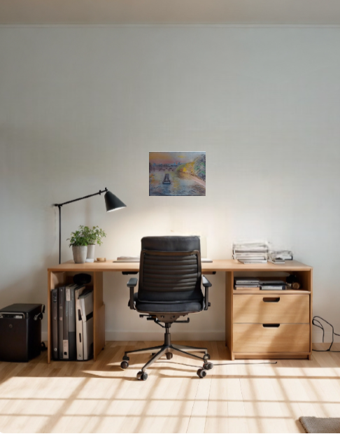 Original painting made with inks on cotton canvas. The subject represents a view of the Seine in Paris in a sunset with golden lights. In the center is the silhouette of the Bateaux Mouches, the famous tourist boat on the Seine. This particular technique, in addition to giving the painting shine, brilliance and variability of colors, once dried on the support, becomes extremely stable and permanent. Signed and dated on the front. Excellent condition.