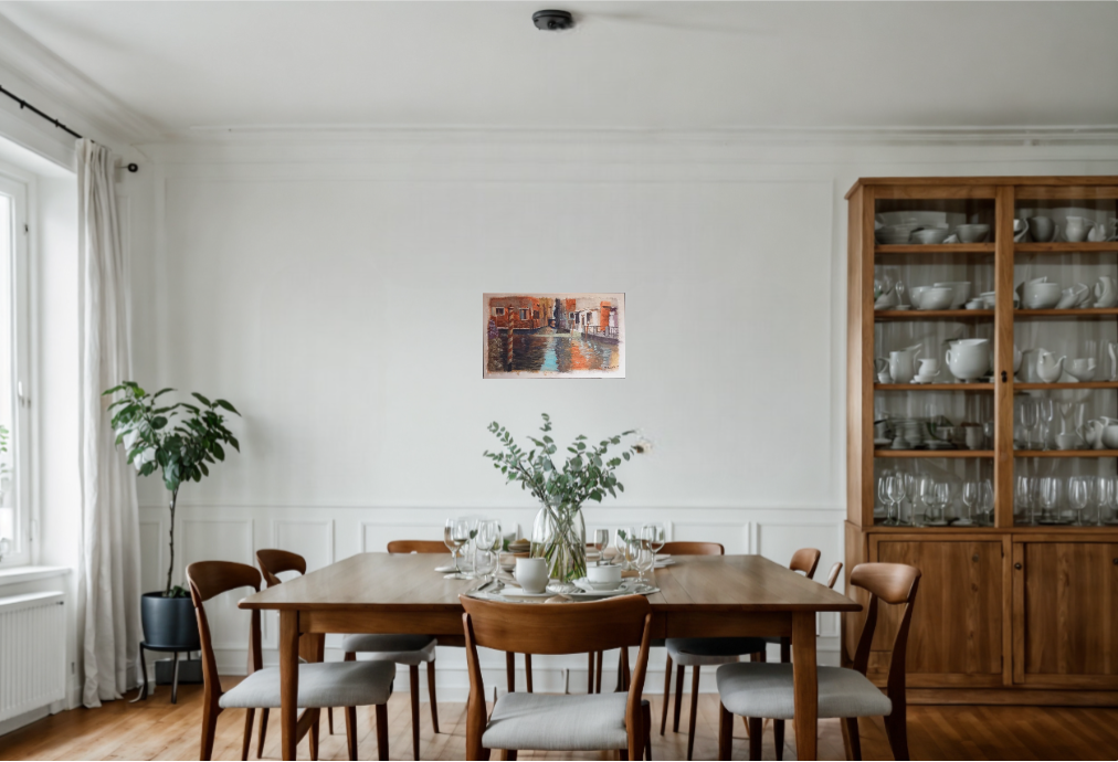 Original painting made in acrylic on canvas suitably prepared to give the painting a fresco appearance with the rendering of brilliant but at the same time opaque colors. The subject is a detail of the Venetian canals with the observation and study of the painter who focuses on the lights and reflections on the water that becomes the protagonist among the various elements of the composition. Signed and dated. Excellent condition