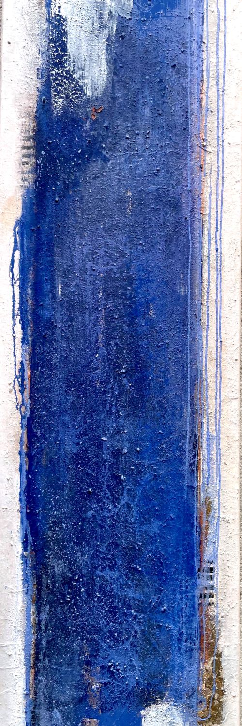 This work impresses with its vast range of deep blues, evoking the vastness of the ocean. The rich, layered texture creates the illusion of undulating waves, creating a captivating visual dynamic. The bold use of blue, interrupted sporadically by touches of silvery white, suggests wave crests, providing a subtle yet poignant light. In the background, earthy shades frame the scene, anchoring the blue expanse in a tangible reality. The horizontal composition reinforces the idea of the horizon, inviting the viewer to contemplate infinity. The absence of distinct forms enhances the abstraction, allowing for a personal interpretation of the maritime immensity. This work is distinguished by its ability to embrace simplicity while evoking a fascinating emotional and sensory depth.