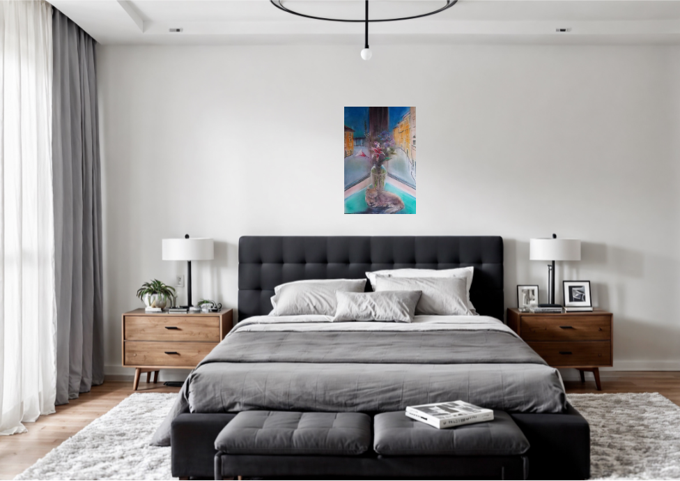 Original painting made with inks on cotton canvas. The subject represents a view of the Grand Canal of Venice in the light of early evening seen from a corner window where the artist has placed a transparent vase of flowers that becomes the element on which the lights and colors of the outside are reflected. The resting cat indicates the first quiet hours. Signed and dated on the front. Excellent condition.