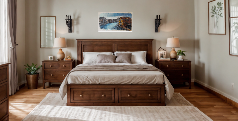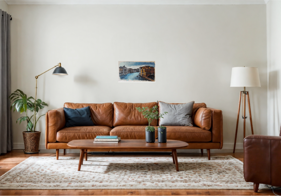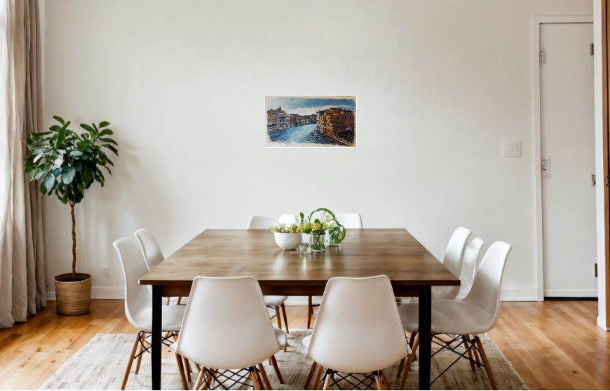 Original painting done in acrylic on canvas. The subject gives a glimpse of the Grand Canal in Venice on a cloudy day. The artist studied the contrasts of shadow and light, the reflections on the water. The acrylic technique is highlighted here by the opaque aspect of the painting similar to the fresco, all done on a preparation applied with a spatula suitably designed to obtain this final effect. . Signed and dated on the front. Excellent condition.