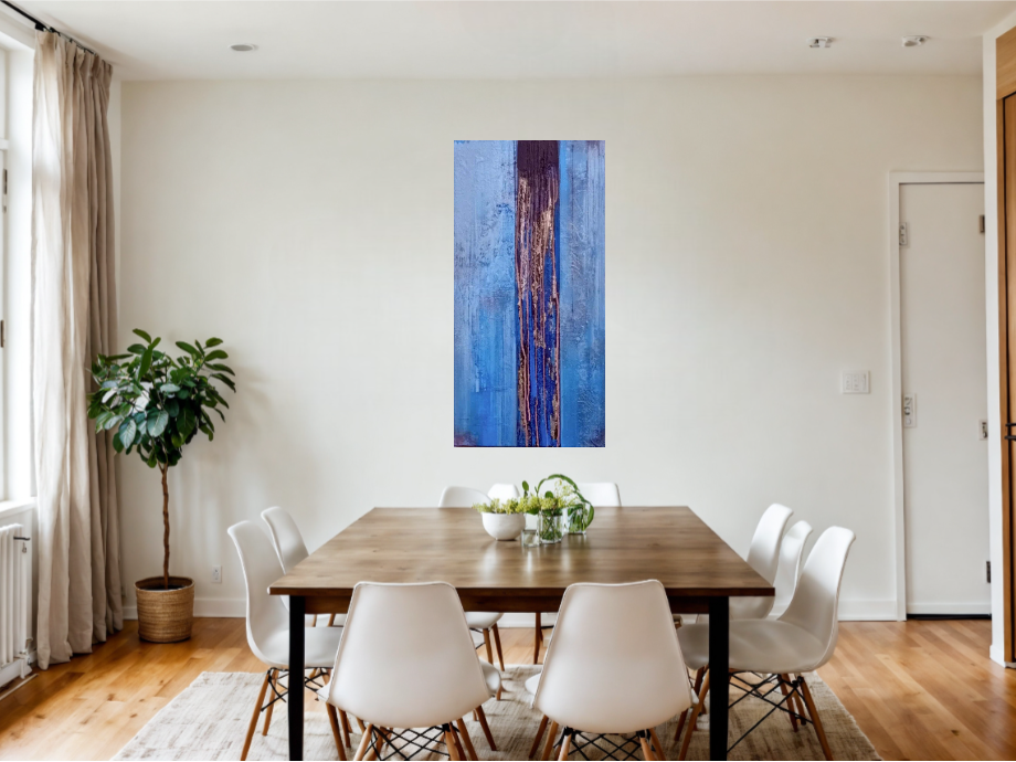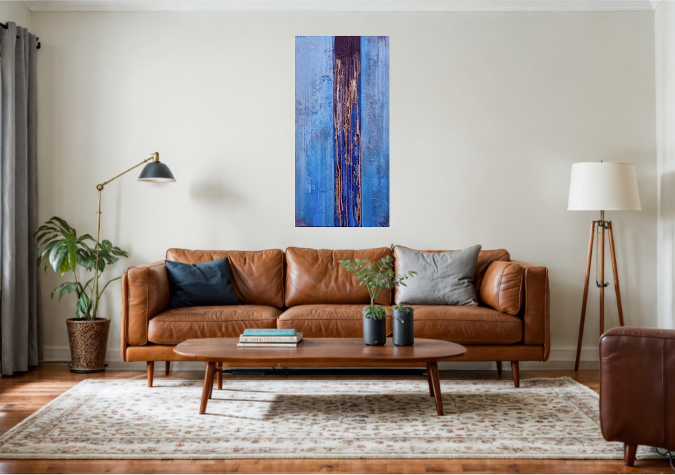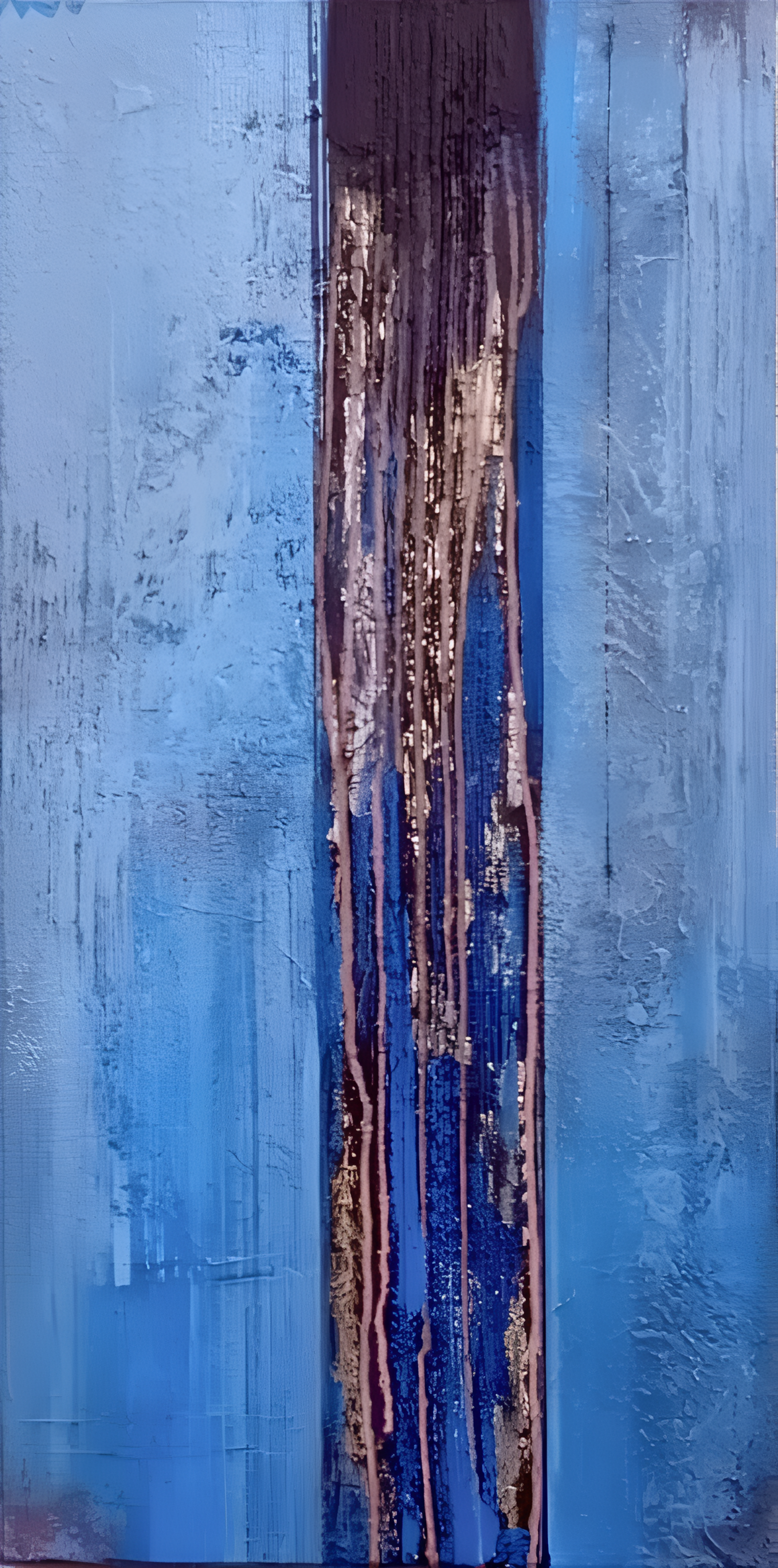“ Blue Vibrations” evokes a vertical energy, a force that flows through the canvas in a balance between matter and light. A deep blue unfolds in the background, textured, moving, like a silent wave. In the center, a dark line rises, streaked with golden and copper reflections that seem to capture a fleeting light. This column of color pulsates, resonates, creating a tension between stillness and movement .