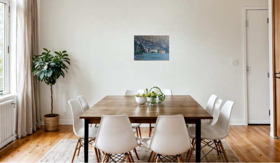 This is an original canvas painted from life depicting the Villa d'Este in Cernobbio, Lake Como. The artist's aim is to capture the beauty of the afternoon lights and colours reflected on the mountain surrounding the Villa D'Este, a splendid location on Lake Como in northern Italy. Signed and dated on the front.