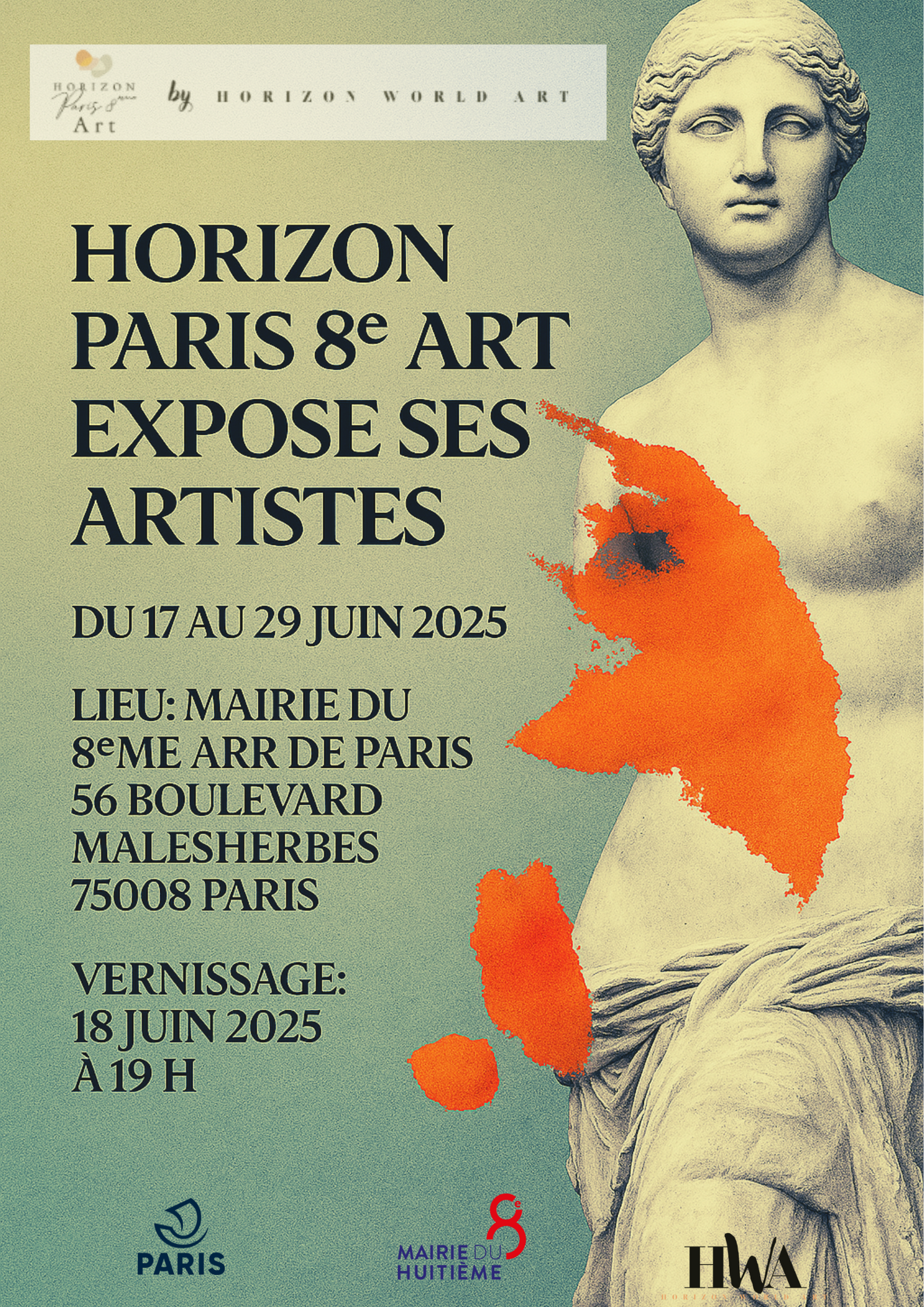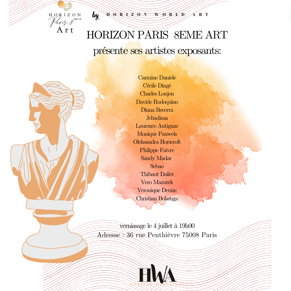 HORIZON PARIS 8ÈME ART by HORIZON WORLD ART est heureux de vous annoncer sa prochaine exposition collective, qui se tiendra du 17 au 29 juin 2025 dans la salle d’exposition de la Mairie du 8e arrondissement de Paris.