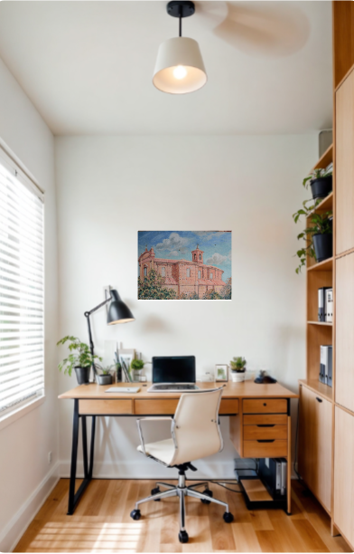 Peinture originale réalisée à l'huile sur toile. Le sujet se déroule dans l'église San Domenico du XVe siècle à Cesena, une ville du centre-nord de l'Italie. Le peintre a tenté de capter la lumière de l'après-midi se reflétant sur les anciens murs de l'église, en plaçant son chevalet sur la colline en face avec la possibilité d'obtenir un point de vue depuis un plan surélevé. La toile de jute de base sur laquelle l'œuvre a été réalisée donne plus de corps à la matière colorée, ainsi que l'éclat et la vivacité des nuances qui conservent leur aspect opaque. La couche matérielle du tableau devient fonctionnelle avec la surface des murs anciens avec leur rugosité, élément qui augmente leur charme. Signé et daté au recto.