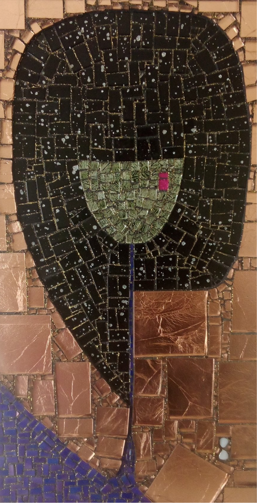 Matériaux: Planche contreplaqué, carreaux marron, pâte de verre irisée bleu, mosaïque vert et noir