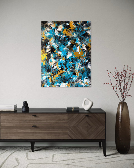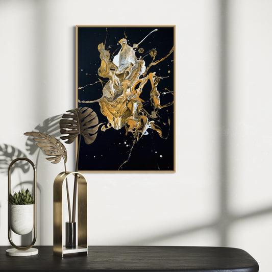 Le doré, lui, s’impose comme une respiration. Il apporte une dimension sacrée, presque spirituelle, rappelant la lumière qui surgit au cœur de l’obscurité. Ses reflets précieux transforment la toile en un espace de réconciliation : entre chaos et harmonie, entre matière brute et éclat divin.