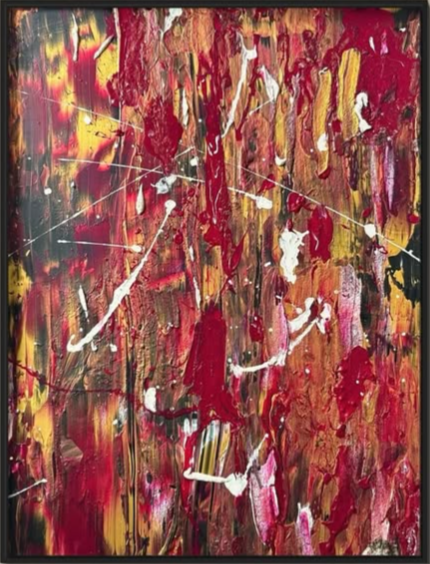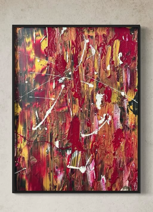 Cette œuvre naît de la collision entre la violence du rouge incandescent et la douceur lumineuse du doré. Le rouge, en éclats fluides et fragments brûlants, évoque la braise, la passion et l’explosion intérieure.