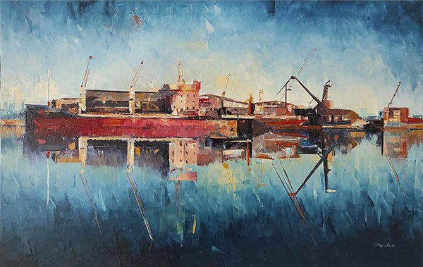 Par sa technique de peinture au couteau, ce tableau offre une texture riche et vibrante qui capte aussitôt le regard. Les grues et les cargos rouges, emblèmes de l’activité maritime, se détachent avec intensité sur le bleu apaisant de l’eau. Ce contraste de couleurs crée une atmosphère à la fois énergique et sereine. Les reflets des structures dans l’eau apportent une profondeur supplémentaire, suggérant l’harmonie entre l’empreinte humaine et la nature. L’ensemble évoque le mouvement et la vitalité d’un port en pleine effervescence. L’œuvre saisit ainsi l’essence du port de Saint-Malo, alliant la puissance du commerce maritime à la quiétude de son cadre. Elle invite à contempler et à apprécier la richesse de la vie portuaire.