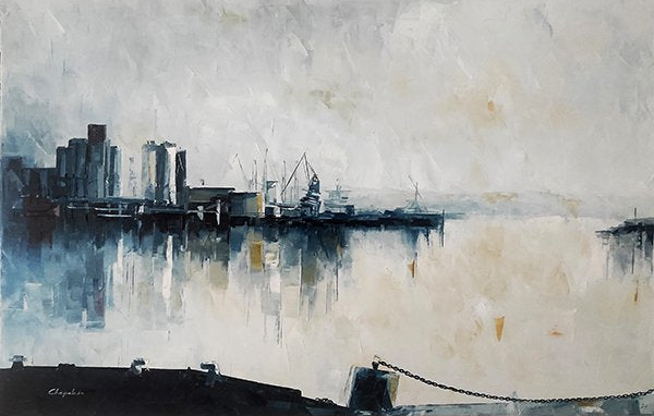 Ce tableau, qui représente la rade de Brest voilée par la brume matinale, dégage une atmosphère à la fois mystérieuse et apaisante. Le voile de brume reflété dans l’eau diffuse une douceur presque irréelle, invitant à la contemplation. L’émergence des structures de fer au cœur de ce paysage brumeux introduit une dimension industrielle qui contraste avec la quiétude ambiante. Ce dialogue entre nature et artifice crée une harmonie singulière, où la force des machines semble s’intégrer au calme de la rade. La technique du couteau, par ses textures et sa puissance visuelle, accentue l’intensité de la scène. Les coups vifs suggèrent un mouvement latent, comme si brume et eau ne cessaient de se transformer. L’œuvre saisit ainsi un instant suspendu, où l’industrie et la nature cohabitent dans une paisible union.