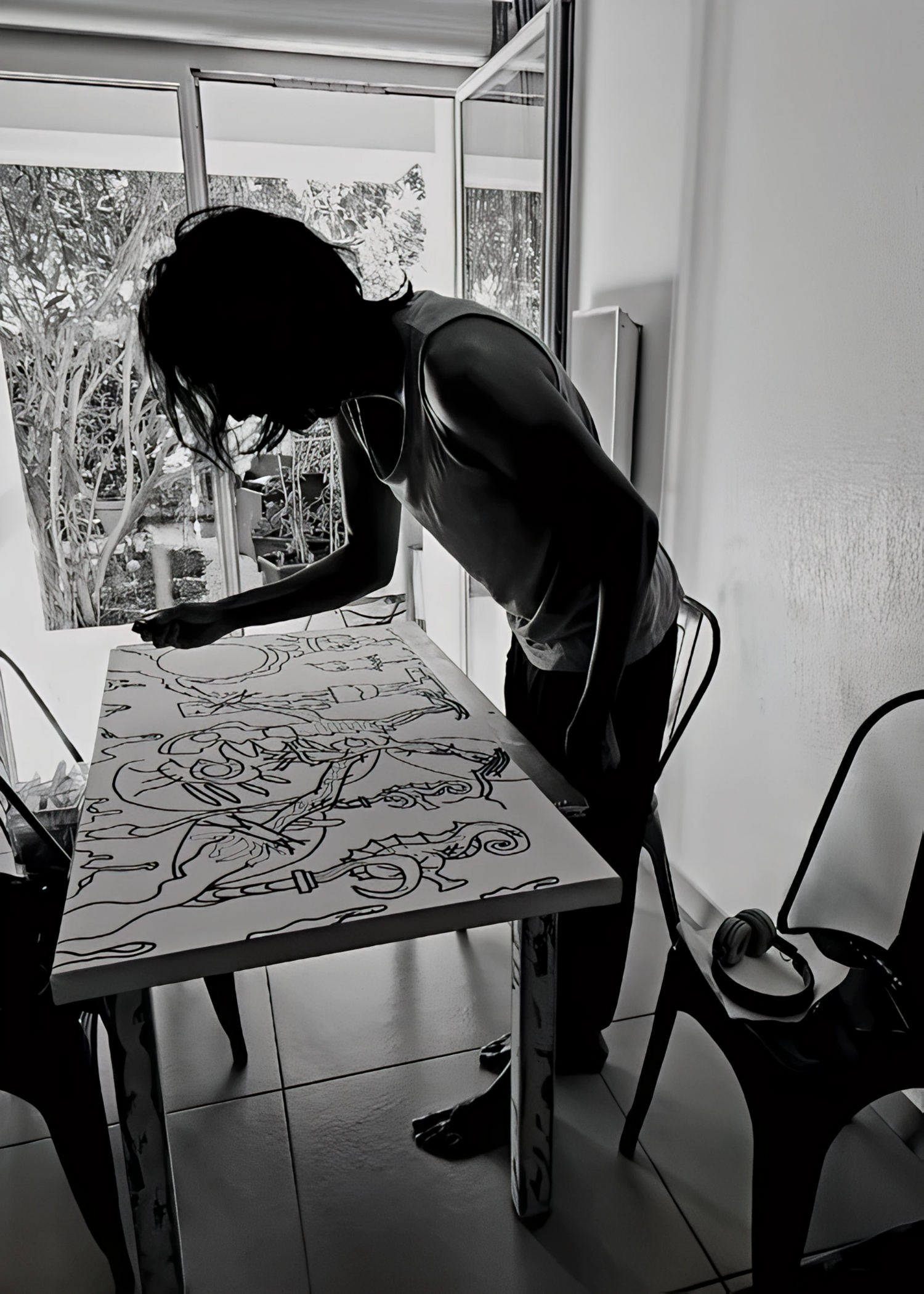 Mahrk Gotié, issu d'une formation en écriture, utilise le Posca acrylique sur toile et papier. Son style, dénué de fioritures, mise sur la simplicité pour favoriser l'échange d'émotions. Oscillant entre divers styles, il explore les thématiques de l'enfance désenchantée, du chaos et de l'expérimentation. Ses œuvres, à la fois intimes et personnelles, respirent l'authenticité et invitent à une réflexion sobre sur l'apparence et la communication.