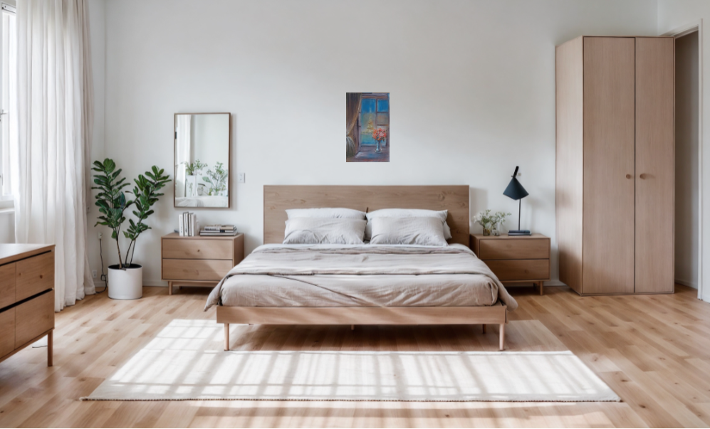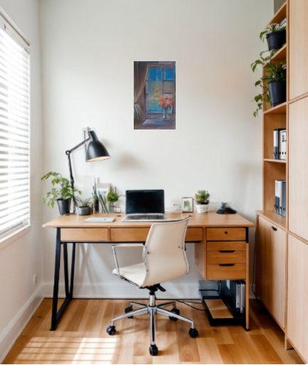 Peinture originale réalisée aux encres sur toile de coton. Le sujet représente une vue de Paris la nuit, avec la Tour Eiffel illuminée et la Seine. Le vase de fleurs rouges sur le rebord de la fenêtre accentue la luminosité de la composition, contrastant avec le bleu de l'eau de la rivière et du rideau et rendant le tout encore plus vibrant. Signé et daté au recto. Excellent état.
