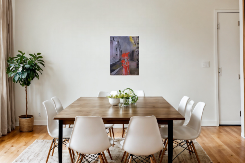 Peinture originale réalisée avec des encres sur toile de coton. Le sujet représente un masque vénitien typique de la Commedia dell'Arte du XVIIIe siècle. Le rouge vif du tissu des robes contraste admirablement avec l'harmonie des gris qui entourent le personnage du premier plan et accentue son éclat. Cette technique particulière, en plus d'apporter de la brillance et une sensation de couleur changeante, devient extrêmement stable et permanente une fois séchée sur le support. Signé et daté au recto. Excellent état.